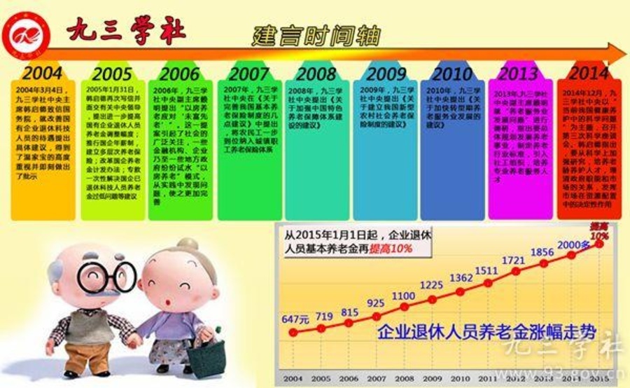 國有企業(yè)退休人員養(yǎng)老金的提高,改善了這一群體的生活狀況。然而,隨著中國快速邁進(jìn)老齡化社會(huì),還應(yīng)從更高層次,更廣視野破解這一“難題”。2006年,九三學(xué)社中央副主席賴明提出“以房養(yǎng)老應(yīng)對(duì)‘未富先老’”。這一提案引起社會(huì)廣泛關(guān)注,一些金融機(jī)構(gòu)、企業(yè)乃至一些地方政府紛紛試水“以房養(yǎng)老”模式,從實(shí)踐中發(fā)現(xiàn)問題,使之更加完善;2007年,九三學(xué)社中央《關(guān)于完善我國基本養(yǎng)老保險(xiǎn)制度的幾點(diǎn)建議》中提出,將農(nóng)民工一步到位納入城鎮(zhèn)職工養(yǎng)老保險(xiǎn)體系;2008年,九三學(xué)社中央提出《關(guān)于加強(qiáng)中國特色養(yǎng)老保障體系建設(shè)的建議》;2009年,九三學(xué)社中央提出《關(guān)于建立我國新型農(nóng)村社會(huì)養(yǎng)老保險(xiǎn)制度的建議》。2010年,九三學(xué)社中央提出《關(guān)于加快轉(zhuǎn)型期養(yǎng)老服務(wù)業(yè)發(fā)展的建議》;2013年,九三學(xué)社中央副主席賴明就“養(yǎng)老服務(wù)業(yè)發(fā)展問題”進(jìn)行調(diào)研,指出要總體規(guī)劃發(fā)展養(yǎng)老事業(yè),制定養(yǎng)老行業(yè)標(biāo)準(zhǔn),引入社工組織,培養(yǎng)專業(yè)養(yǎng)老服務(wù)人才。2014年12月,九三學(xué)社中央以“當(dāng)前我國健康養(yǎng)護(hù)中的科學(xué)問題”為主題,在京召開第三次科學(xué)座談會(huì)。韓啟德指出,要從科學(xué)上加強(qiáng)研究,培養(yǎng)老齡養(yǎng)護(hù)人才,理清政府職能和市場的關(guān)系,發(fā)揮市場在資源配置中的決定性作用。