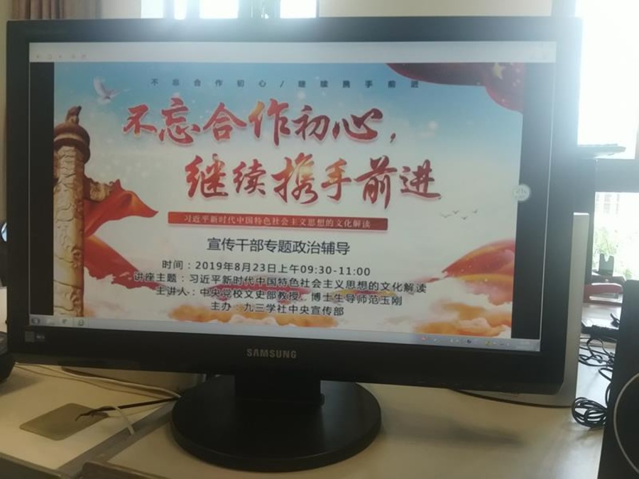 按照《九三學(xué)社中央深入開展“不忘合作初心,繼續(xù)攜手前進(jìn)”主題教育活動(dòng)實(shí)施方案》文件要求和九三學(xué)社海南省委的工作部署,充分發(fā)揮遠(yuǎn)程網(wǎng)絡(luò)在線教育的便捷傳播優(yōu)勢(shì),8月23日上午,九三學(xué)社海口市委員會(huì)專職副主委林銀燕帶領(lǐng)機(jī)關(guān)干部,參加九三學(xué)社中央宣傳部組織的“不忘合作初心,繼續(xù)攜手前進(jìn)”主題教育活動(dòng)第一期遠(yuǎn)程網(wǎng)絡(luò)學(xué)習(xí)。