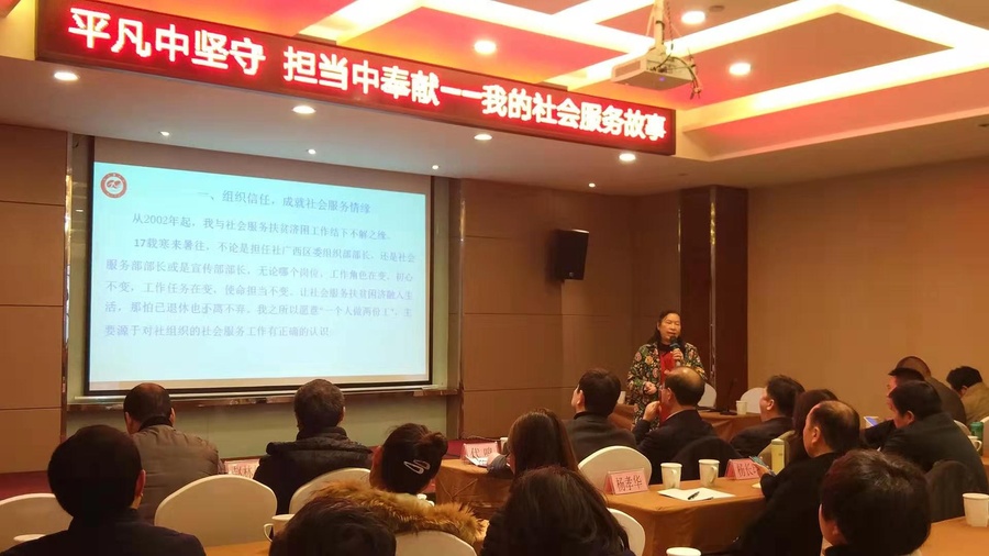 楊麗英以《平凡中堅(jiān)守 擔(dān)當(dāng)中奉獻(xiàn)——我的社會服務(wù)故事》展開事跡宣講,分別從“組織信任,成就社會服務(wù)情緣”、“主動擔(dān)當(dāng),山鄉(xiāng)扶貧濟(jì)困延綿”、“堅(jiān)守初心,為民分憂砥礪前行”三個(gè)部分,通過一張張感動人心的照片,一個(gè)個(gè)鮮活生動的事例,用質(zhì)樸的語言生動直觀地為大家講述了她作為一個(gè)九三人牢記初心使命、勇?lián)厝危?7年來在社會服務(wù)扶貧活動中組織開展的救災(zāi)濟(jì)困、教育扶貧、醫(yī)療扶貧、產(chǎn)業(yè)扶貧等方面的先進(jìn)事跡,也展現(xiàn)了社中央領(lǐng)導(dǎo)及各級社組織對以她為代表的基層扶貧工作的重視關(guān)心和大力支持。