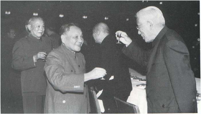 1979年10月,在九三學(xué)社第三屆全國社員代表大會(huì)期間,黨和國家領(lǐng)導(dǎo)人鄧小平、葉劍英、李先念等親切接見了與會(huì)的全體代表。圖為鄧小平等領(lǐng)導(dǎo)同志與周培源副主席互致問候。
